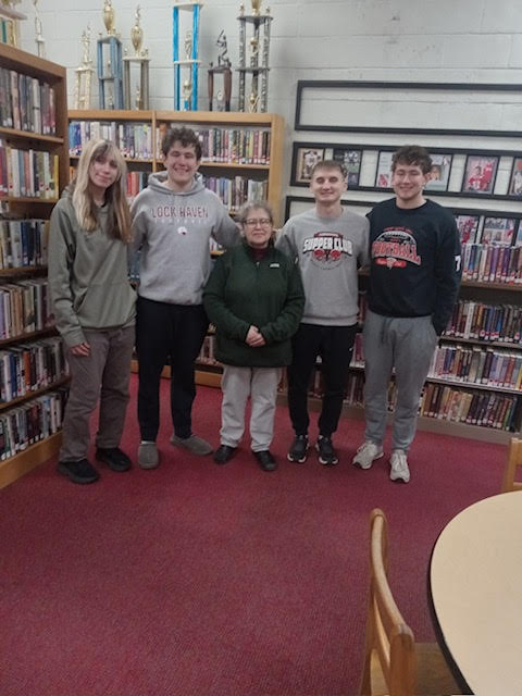 From left are Alexa Nowroski, Chase Balichik, head librarian Vivian McCracken, Andrew